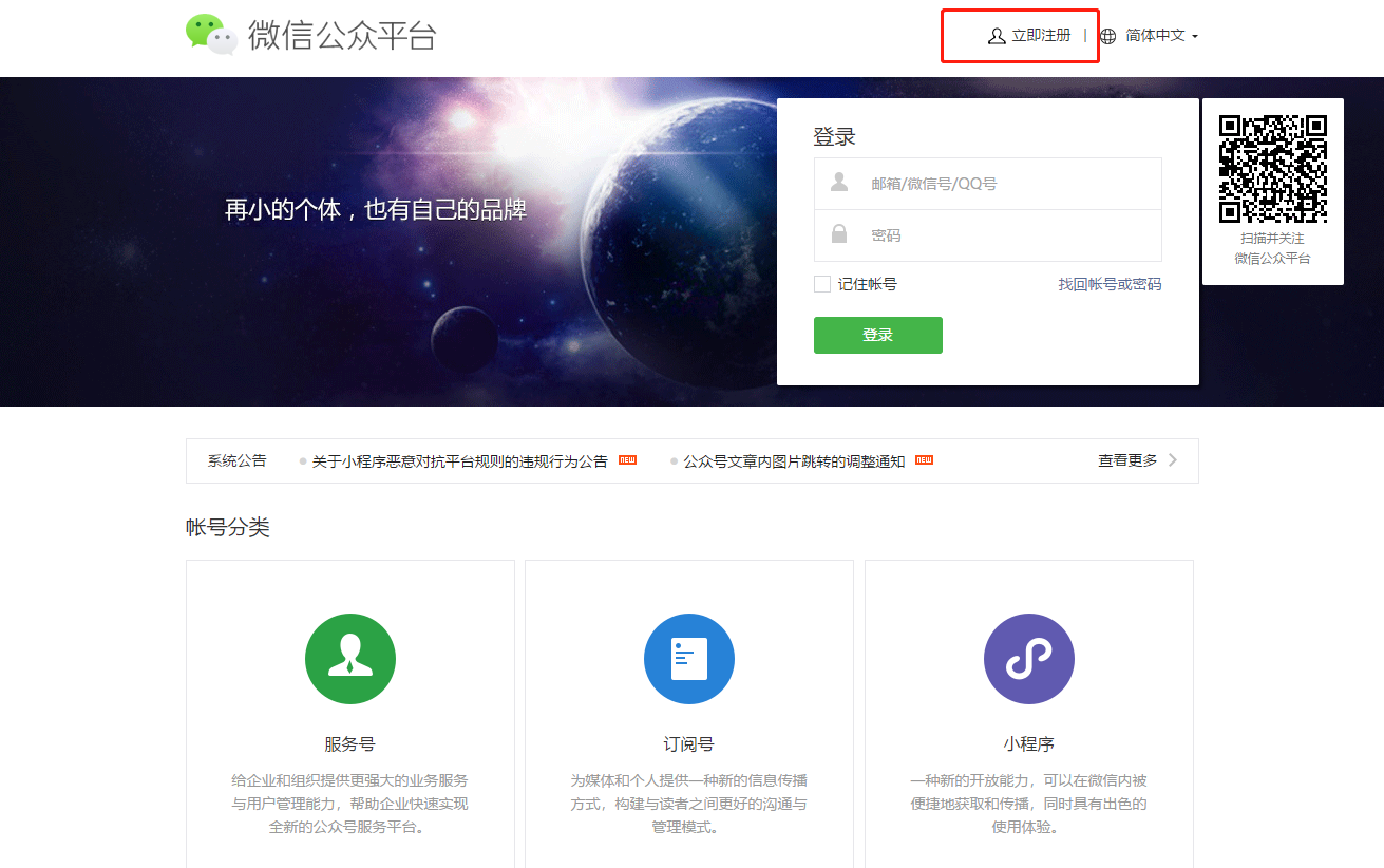 公眾號分:訂閱號、服務號、小程序三種帳號類型,注意注意1個郵箱只能注冊1個帳號。