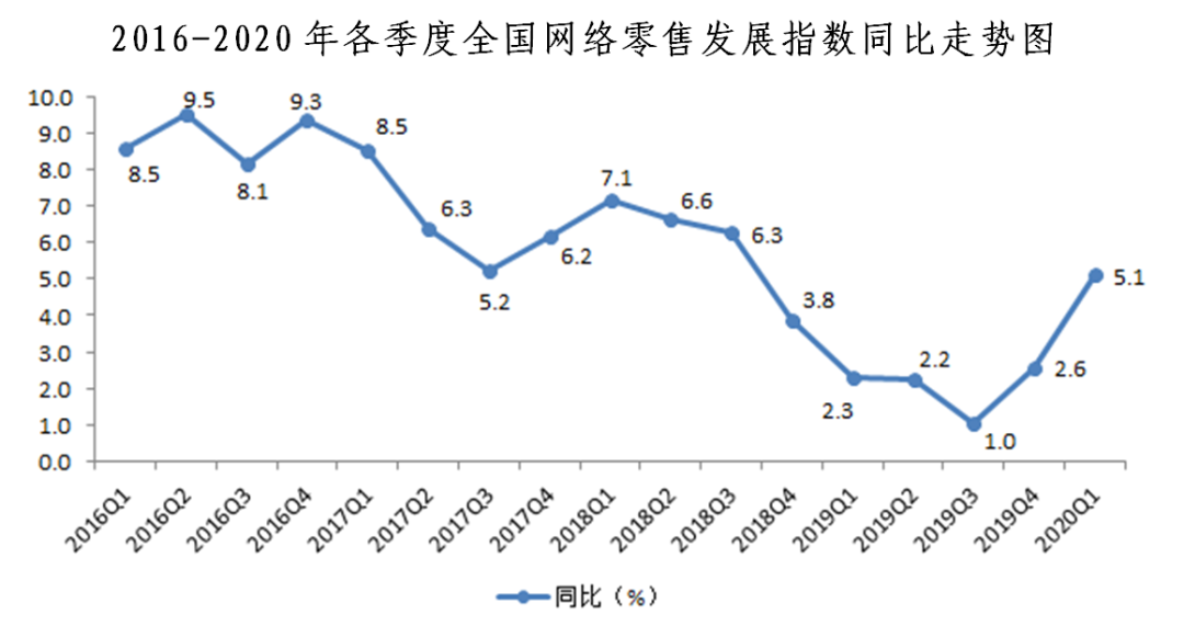 近日,中國國際電子商務中心與易觀聯(lián)合發(fā)布了2020年一季度“全國網(wǎng)絡零售發(fā)展指數(shù)”及其分指數(shù)。2020年一季度,全國網(wǎng)絡零售發(fā)展指數(shù)受疫情影響,環(huán)比下降2.7%,增速較上季度下降6.1個百分點;但同比仍增長5.1%,增速較上季度提升2.5個百分點。